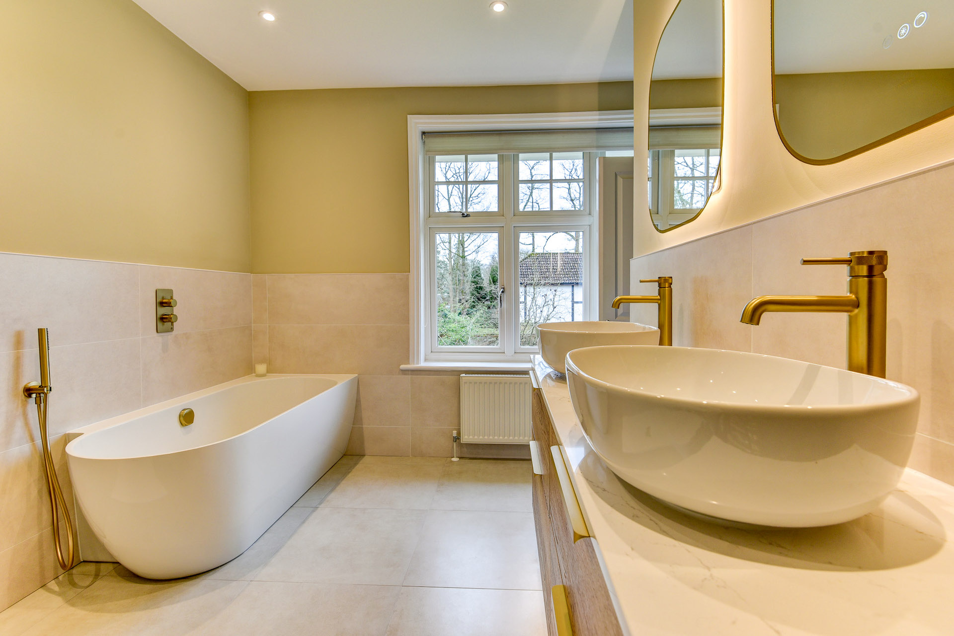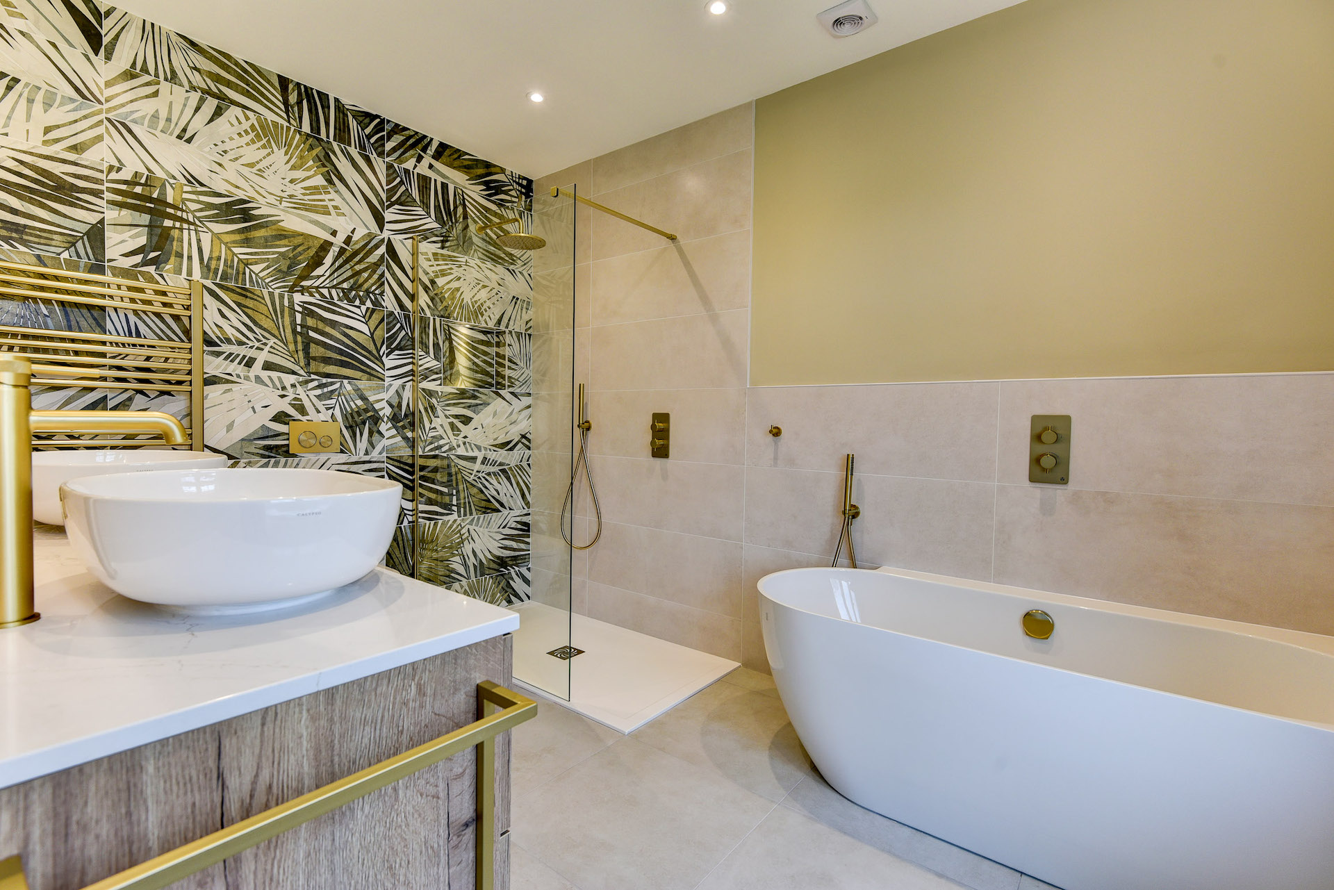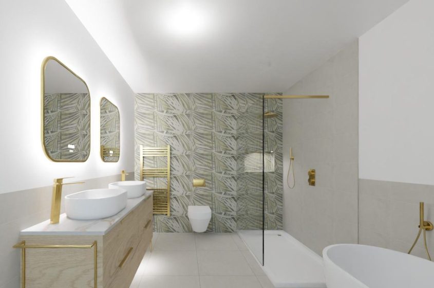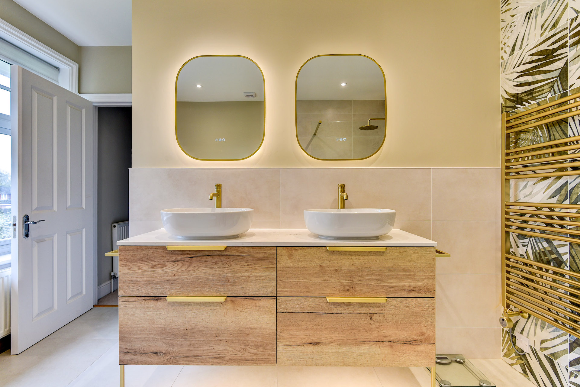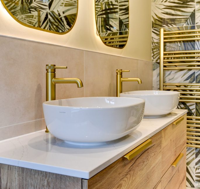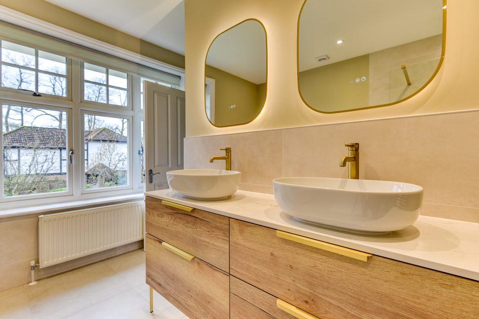 The fantastic furniture choice is the undoubtable highlight of this project, teaming bold Brushed Brass as an accent with a warm oak finish, all while incorporating plenty of modern conveniences like demisting mirrors, knurled taps, and a luxury quartz work surface.